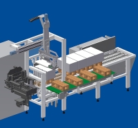 Leistung KE: Konstruktion der Endkappenmagazine, der Zu- und Wegführrollenbahnen, sowie des Robotergreifers mit integrierter Klebepistole. Kollisionskontrolle mittels CAD beim Abholen, Setzen und Verkleben der Endkappen..