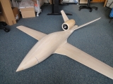 | Eclipse 400: Wäre das nicht ein wunderschöner Elektro-Jet? Vom Hersteller konnte ich auch nach mehreren Anfragen keine Zeichnungen erhalten, und Eclipse Aviation ist leider im Februar 09 in Konkurs gegangen. Es ist also mehr als fraglich, ob dieser wunderschöne Jet über's Prototyp-Stadium rauskommt. Trotzdem habe ich anfangs 09 mal den Rumpf nach Bildern und meiner Fantasie im 3D-CAD modelliert. In der Zwischenzeit ist der ganze Flieger modelliert, und nun entsteht ein vereinfachtes Versuchsmodell in Holzbauweise. Mit diesem will ich die aerodynamische Auslegung testen. Speziell interessiert mich die Wirkung des Impellers im "Windschatten" des Rumpfs, sowie die richtige Ausrichtung der Schubachse. Prototyp: Spannweite ca 1.2m, Antrieb mit 69-er Impeller in einer Viking-Gondel. |